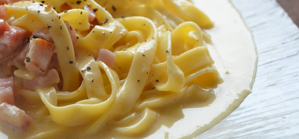 料理は、生パスタと自家製カレーが中心です。卵たっぷりでデュラムセモリナ粉を使った生パスタは当店の手打ちです。これに合わせるソースはボロネーゼとカルボナーラです。ボロネーゼはオリーブオイルで油ぬきしたミンチをワインとフォンドボーでしっかり煮込んだリッチな味です。カルボナーラは、乳脂肪分の高い生クリームを使用しコクのあるものとなっています。